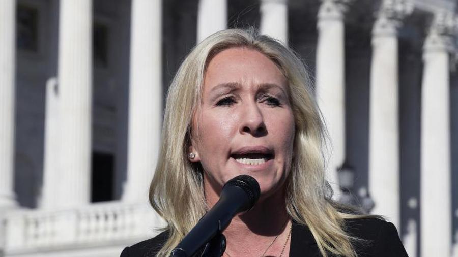 Marjorie taylor greene of georgia speaks as trump listens at a campaign rally in support of senate candidates kelly loeffler and david back in 2019, before georgia republican marjorie taylor greene was elected to the house of representatives, a video was recorded showing.